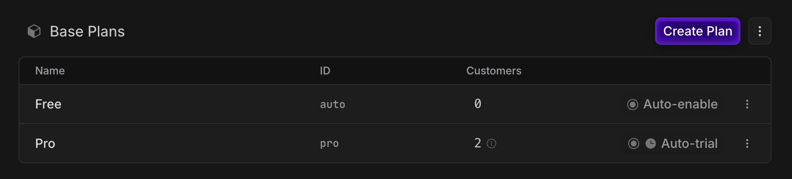 Since no card is required, you can choose whether the plan is enabled automatically when a customer is created, or if you want to manually attach the plan to a customer (eg, when they opt-in to the trial).If you switch the “auto-enable” flag to true, the trial plan will be automatically applied to newly created customers. The plan will be labelled as an