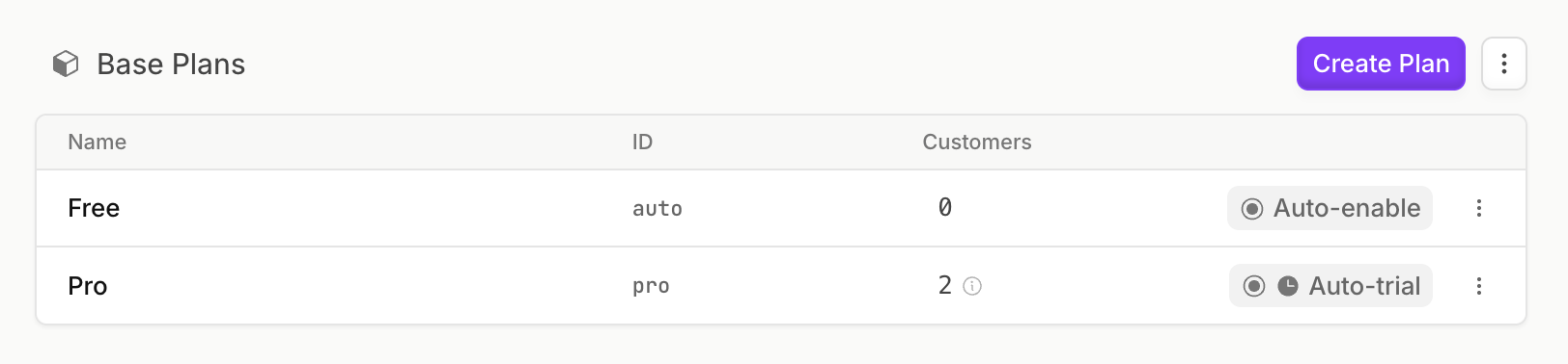 Attach the plan to the customer to enable the trial. Since no card is required, no checkout is needed. If you switched the “auto-enable” flag to true, you can skip the attach step as the trial will be automatically applied to newly created customers.The trial will only be applied once per customer.