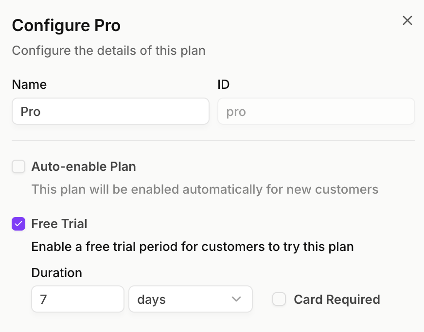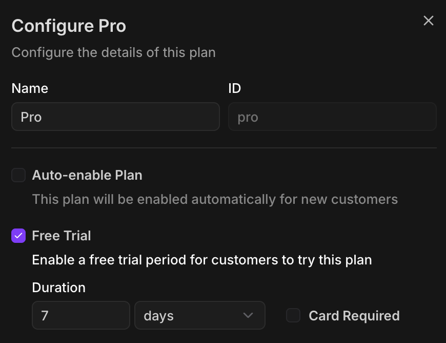 auto-trial plan. Customers will only be able to access this trial once.You can also create another free auto-enable plan without a trial. This will be enabled if the customer does not add a payment method during the trial, or if they cancel their plan later on.